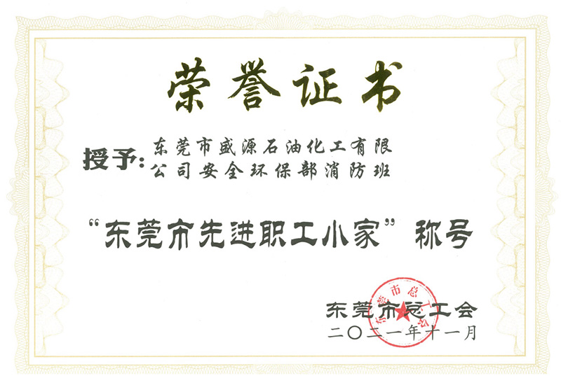 盛源石化安全環保部消防班榮獲“東莞市先進職工小家”稱號